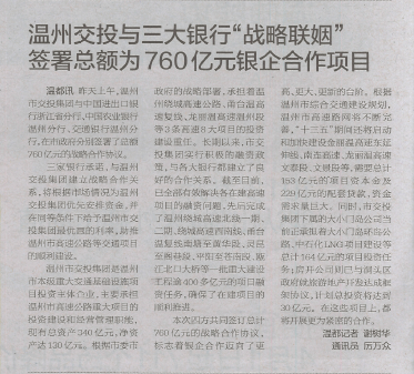 温州交投集团与三大银行“战略联姻” 签署总额达760亿元的银企合作项目