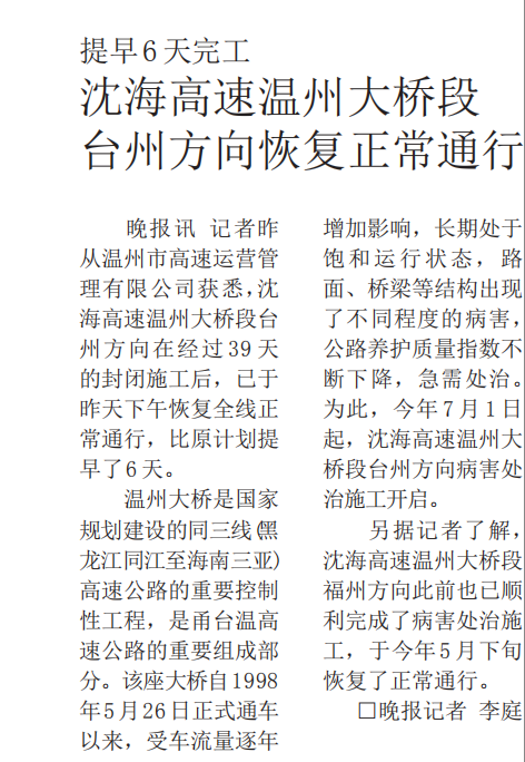 沈海高速温州大桥段台州方向恢复正常通行
