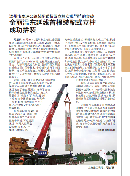 金丽温东延线首根装配式立柱成功拼装(12月交通导报)