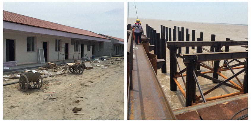 截止目前,南岸生活区及拌合区已能供电供水,工地试验室、拌合站、员工宿舍建设已基本完成,办公区一二楼、项目部会议室砖砌工程也已结束,钢筋加工厂已按成横梁安装。北岸已完成拌合站及钢筋场基础,现正在进行住宿区的房屋搭设。此外,北岸临时栈桥完成22跨,南岸25#~28#墩水上平台的钢护筒及钢管桩已打设完毕,现正在进行27#墩码头平台搭设。