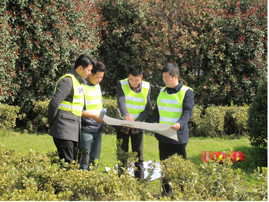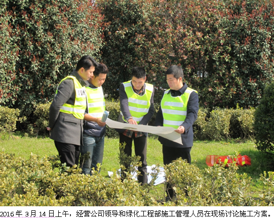 在施工现场,施工人员对原有枯死的乔木、苗木等进行清除,为施工做前期准备。钟董对在场的施工管理人员提出了三点指导意见:一是严格按照设计图纸要求施工;二是要处理好人工和挖机的结合,抢抓工程进度;三是要确保工程质量和施工安全,高空作业必须配备保险绳。