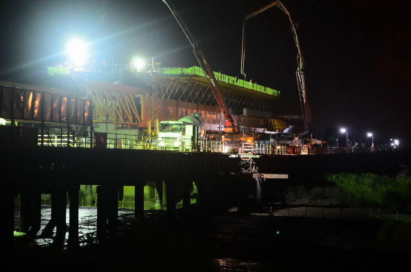 经过16小时的连续奋战,甬台温复线瓯江口跨海南大桥首跨移动模架现浇箱梁于