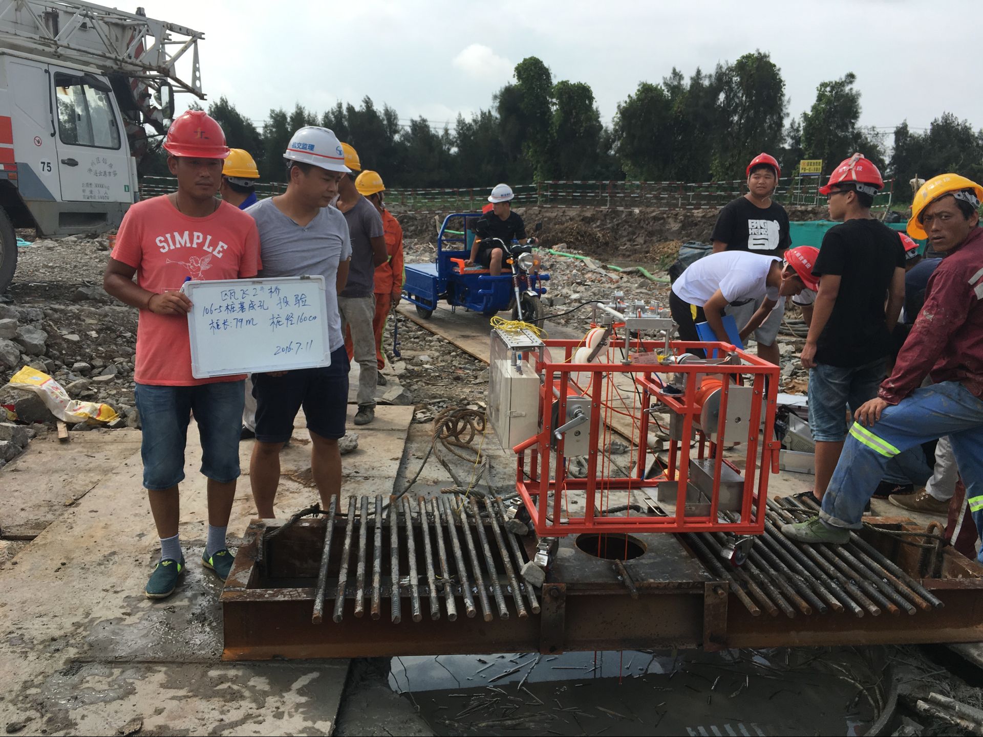 首根桩基位于主线桥106-5#墩,桩径1.5米,桩长79米。由于该区域地质条件较为复杂,不可预见因素众多,给质量控制带来一定的困难。为保证桩基施工质量,施工、监理单位对钻孔桩的每一个环节都进行严格控制。施工前,项目部制定了详细的施工方案,监理办组织召开钻孔灌注桩专题会议,论证方案的可行性,并进行周密、详细的技术、安全交底;在施工过程中,施工单位技术负责人坚持跟班作业,温瑞处、监理人员到现场检查指导,全程监控,确保各项检测指标符合技术规范要求。