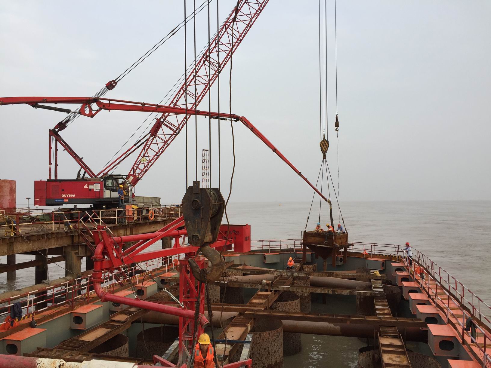 经过8小时的连续奋战,2016年10月21日23时,飞云江跨海特大桥最后一个防撞钢套箱成功封底,标志着大桥防撞套箱施工全部顺利完成。