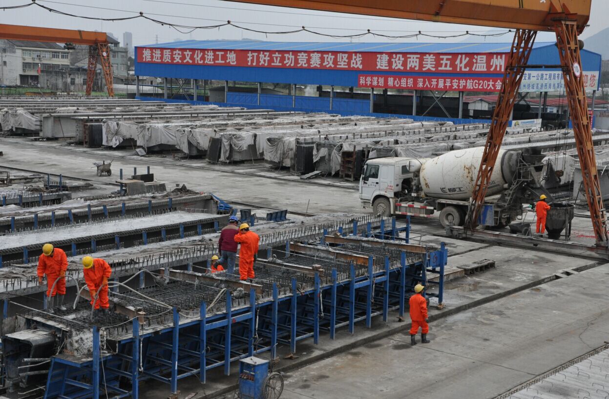 施工过程中,项目部紧抓“安全、质量、进度、管理”不放松。一是重安全。对施工过程中存在的安全隐患和薄弱环节检查,及时发现、整改相关隐患,确保梁板预制过程安全可控。二是保质量。严把原材料进厂质量关的同时,认真做好梁板质量控制,从钢筋绑扎、焊接、立模、浇筑、拆模到张拉、压浆的每道工序都进行严格监控,实现了高质量的流水化作业管理。三是抓进度。在重安全保质量的前提下,适时掀起大干高潮,确保梁板生产稳步推进。四是精管理。在整个梁板预制过程中进行精细化管理,形成了由项目负责人、技术负责人、现场技术人员、施工班组四级联动的管理体系。