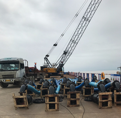 二是注水水泵安装到位并进行抽水试验。施工单位将重点验证水泵功效是否满足钢沉井注水要求,即注水水泵需具备往内注水及往外抽水的能力,且不受沉井吃水深度变化而影响其抽水效率。届时将安装水泵48个,确保以1.5小时注水18000立方的速度一次性完成注水工作。