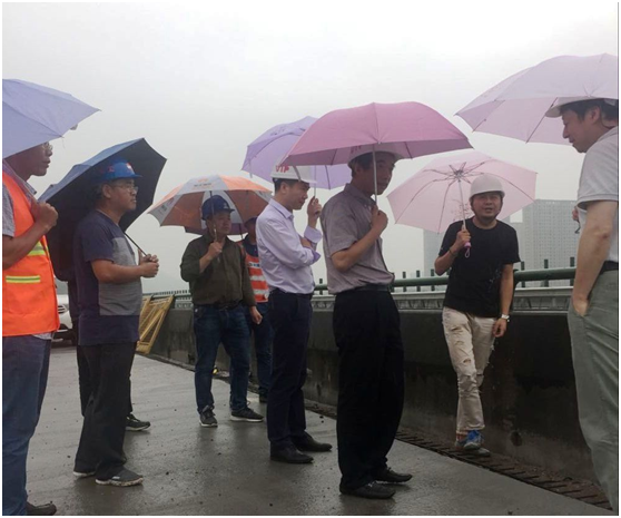 检查组一行冒雨来到乐清高架桥施工现场,乐清高架桥目前正在进行新老桥试验段拼接施工。杨天夫详细了解了新老桥拼宽施工方案和计划,并就高速公路拓宽施工工艺、边通车边施工安全措施及交通组织与工程管理人员进行了深入的探讨。
