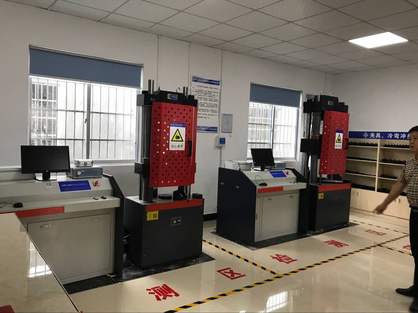 温州瓯江北口大桥土建二标工地试验室坐落于瓯江入海口,独立成院,办公和临时住宿一体化,占地面积2500㎡,建筑面积1300㎡,绿化面积约320㎡。试验室区室设置完整,划分为办公区、生活区和十二大功能室区,并单独开辟试验会议室,配有发电、消防、防盗等硬件设备,保障了试验检测工作的连续安全运行和设备和资料存储安全。试验室仪器配备完善、功能强大,配备有智能监控、数据实时上传等功能的各类先进仪器,且配置了美国大象牌含气量仪、德国喜利得钢筋保护层测定仪等高新设备。其中万能试验机、水泥混凝土压力机、抗折抗压一体机等设备与电脑组合一体,采用先进试验机测控软件,不仅显示界面美观简洁而且操作十分方便。实现了“硬件规模一流、环境优美整洁、布局合理适用、人员技能过硬、机构管理规范”的建设要求。