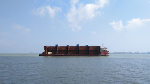第六节段第一块、第二块钢沉井在江苏韩通船厂加工制作,历时月余完成。6月27日17:00下水浮运,历时约48小时,运输距离约362海里。据瓯江北口大桥土建一标项目部技术负责人介绍,第六节段第一块、第二块钢沉井浮运到位后,中铁大桥局将启动钢沉井接高准备工作。并着重克服众多沉井技术难题和现场施工管理难题,不断优化资源配置和施工工艺。在钢沉井接高前,计划对底节钢沉井顶面进行检查,清除顶面杂物,特别注意接高焊缝位置处的清理,对将要进行焊接的位置进行打磨处理,使其平整便于后期的对位焊接。