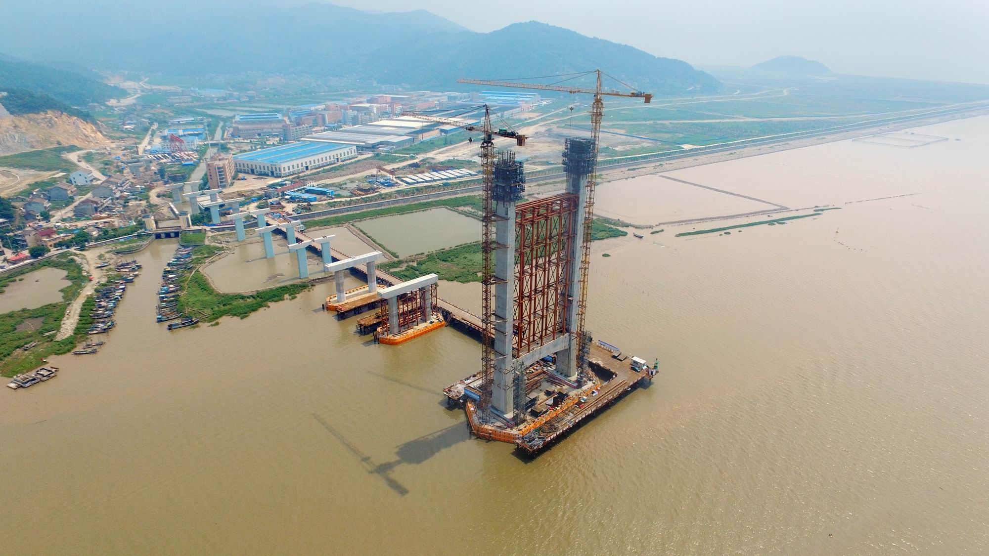 自2015年8月12日开工以来,在全体参建人员的努力下,接连攻克了超长嵌岩桩施工、超大防撞套箱安放、超大体积承台混凝土浇筑等重大施工技术难题,先后克服了高空、高温、台风等不利因素。当前,各项施工有序进行,安全、质量控制得当,各项施工进度、质量均达到预期的目标。