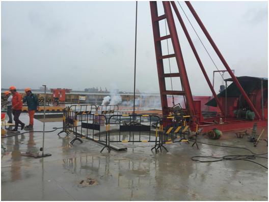 为确保桩基顺利成孔,施工单位先用冲击钻对抛石区进行冲击处理,冲击钻穿过抛石区后护筒跟进,采用“大吨位振动锤+较强刚度的导向架”一次性将护筒插打到位,再用大吨位冲击钻机来进行钻孔作业。本次开钻的首件桩是护筒顺利插打到位后的正式开钻。