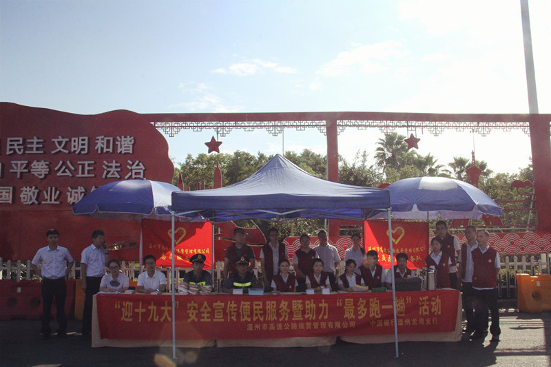 10月12日,为大力弘扬“奉献、友爱、互助、进步”的志愿服务精神,广泛宣传高速公路安全知识,助力“最多跑一趟”改革,运营公司组织党员、团员志愿者在温州东收费站广场开展“迎十九大”安全宣传便民服务暨助力“最多跑一趟”活动,为党的“十九大”胜利召开营造良好氛围。