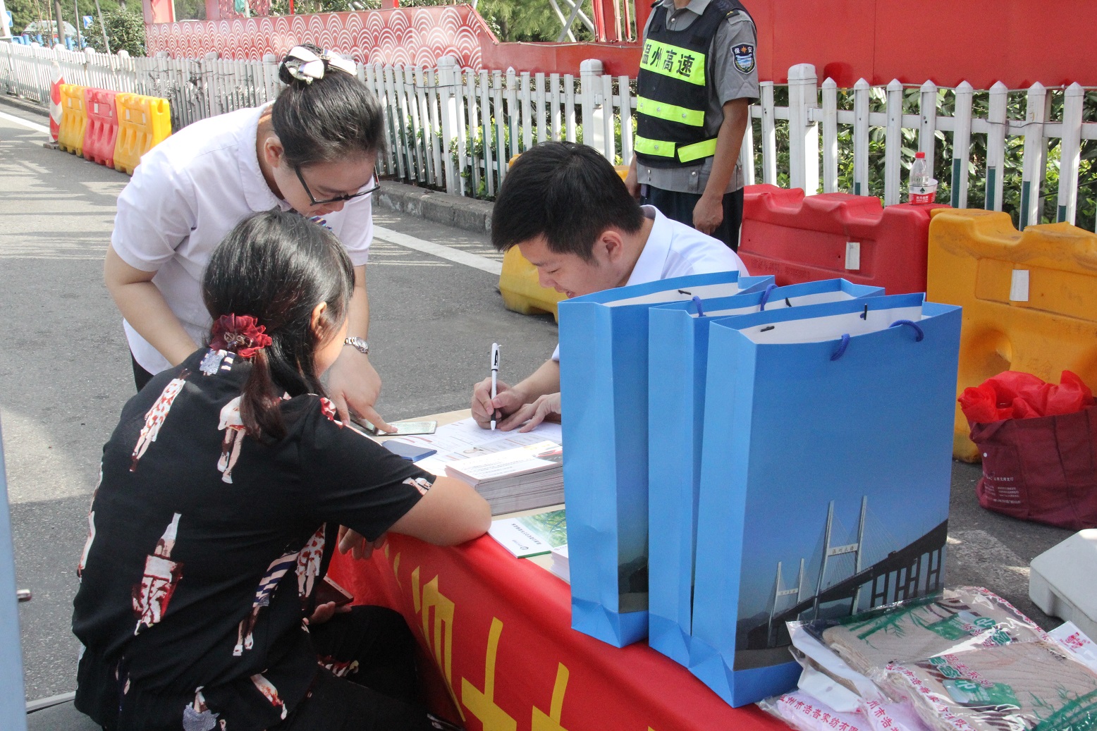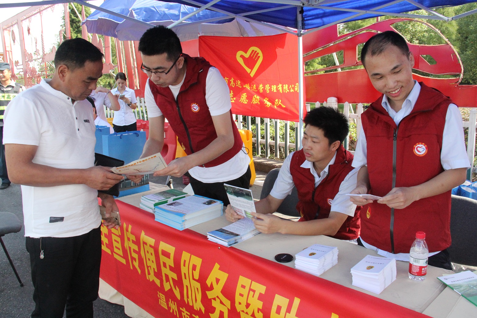 活动现场,志愿者们耐心地接受司乘朋友关于高速公路通行费费率结算、绿通车免费范围、节假日小型车辆免费通行政策等方面的业务咨询,发放《浙江省高速公路地图》《高速公路安全行车简易读本》《高速行车八大禁忌》《杜绝高速公路“滴洒遗漏”倡议书》等宣传资料,提供应急药品、检修工具、开水等精细化、人性化的服务,并向参与互动的司乘朋友赠送包括毛巾、纸巾、风油精等便民用品,延伸窗口优质服务。此外,活动还邀请中国银行温州龙湾支行工作人员现场为过往司乘朋友办理ETC业务,免去窗口审批流程,让司乘朋友享受“最多跑一次”的福利。