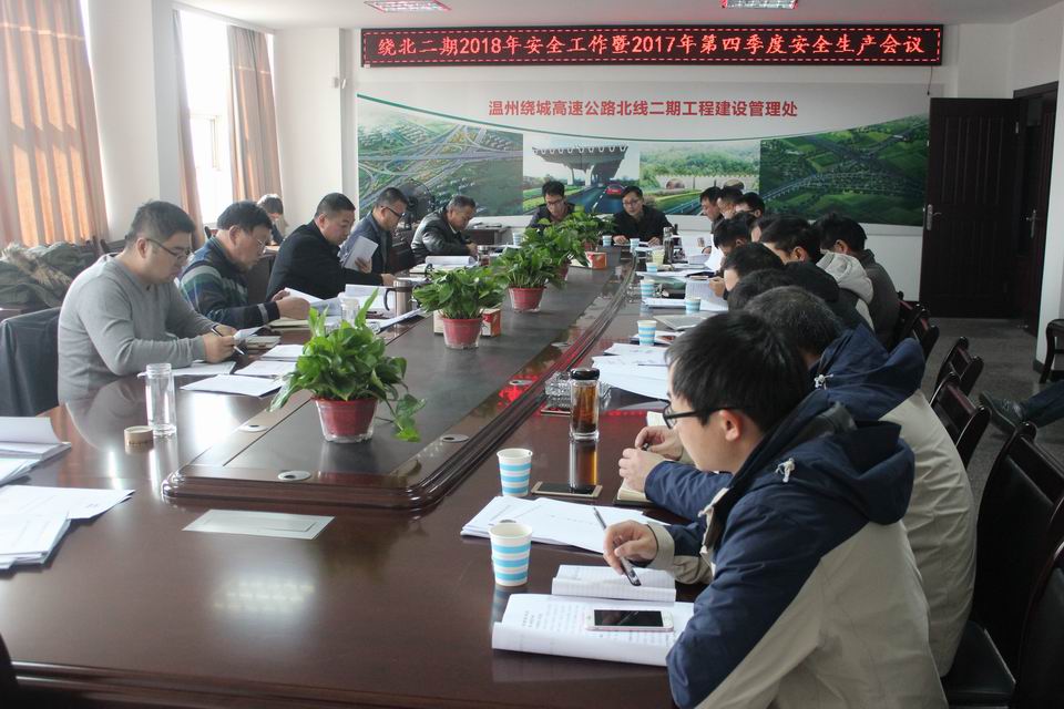1月12日下午,绕北二期工程2018年安全工作暨2017年第四季度安全生产工作会议在管理处四楼会议室召开。沈海公司李革、管理处职能科室、施工单位、监理办等主要负责人及第三方施工安全顾问共30余人参加会议。