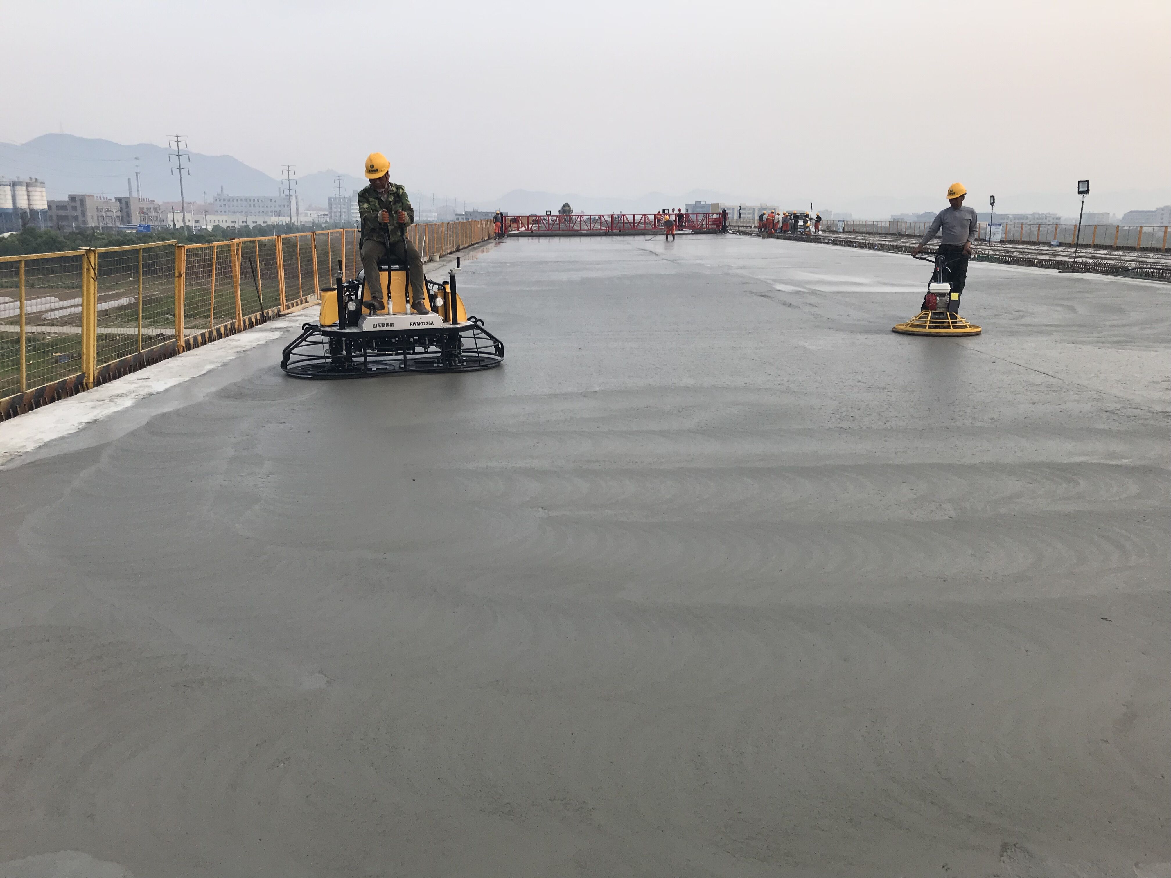 芦浦高架1号桥全长2.85公里,桥面净宽15.25米。为保证首件桥面铺装施工质量,沈海公司提前谋划,精心组织,在施工前对施工设计图纸进行会审,编制施工方案。根据桥面宽度和桥面振捣梁的宽度,采取整体摊铺,加快了桥面铺筑的速度,提高了桥面作业的安全系数。对施工作业人员进行详细技术交底,对配合比设计、施工工艺、设备配置、现场施工工序等方面均严格按照标准化施工要求执行。桥面现浇层混凝土采用砼泵浇筑,人工配合混凝土振捣梁整平摊铺,后面辅以人工进行收面、压光和拉毛。