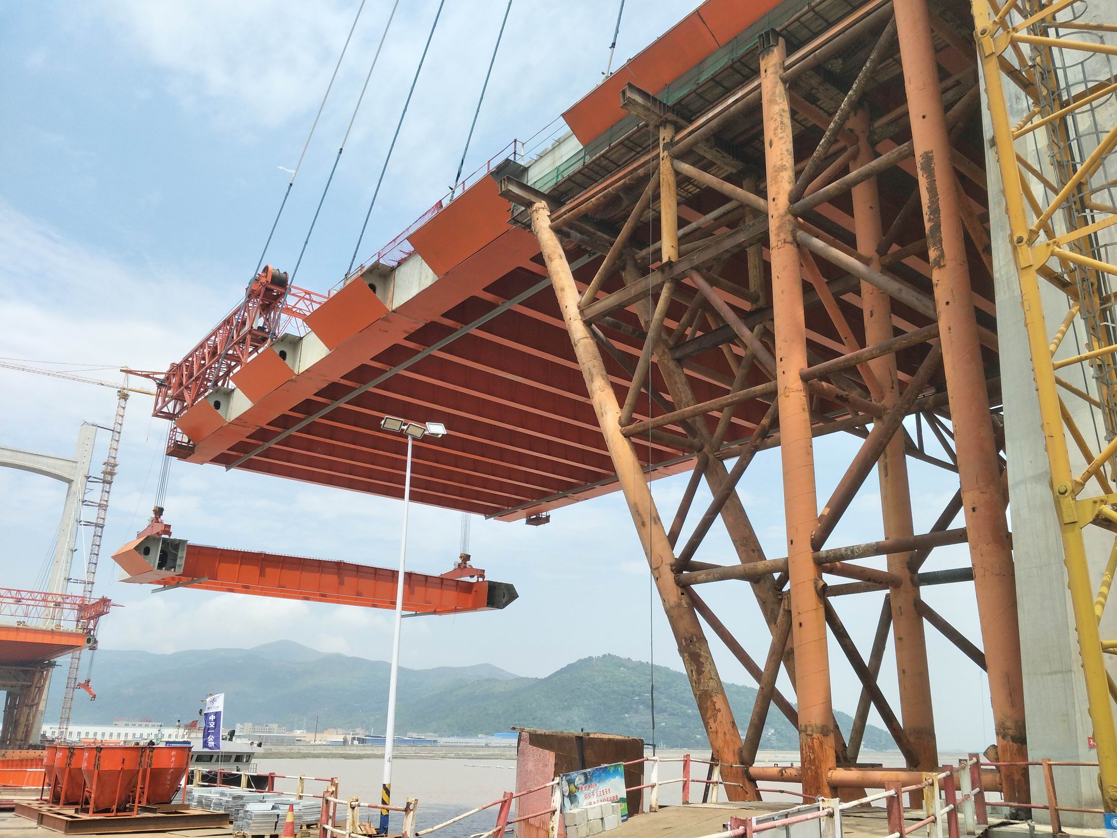 甬台温复线瑞安至苍南段工程控制性工程——鳌江特大桥跨越鳌江口,起点位于平阳县鳌江镇墨城社区、终点位于苍南县龙港镇新美洲村,全长2083米。大桥主桥为双塔双索面叠合梁斜拉桥,主跨跨径为320米。全桥钢箱梁主梁分为10种类型,共有57个梁段,采用浮吊和桥面吊机吊装相结合的施工模式。本次吊装的钢箱梁SB7和SMB7,其中边跨合龙段截面宽37.7米,梁段长12米,重196.7吨,采用“温度配切法”施工。
