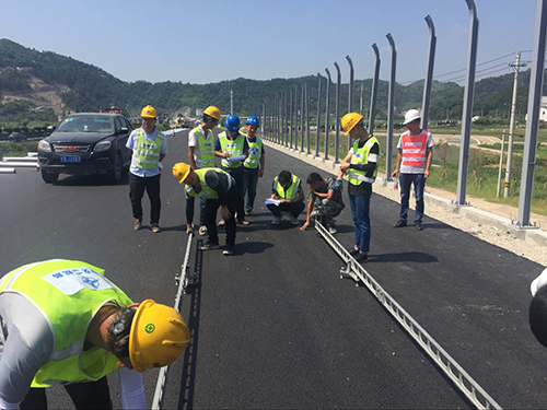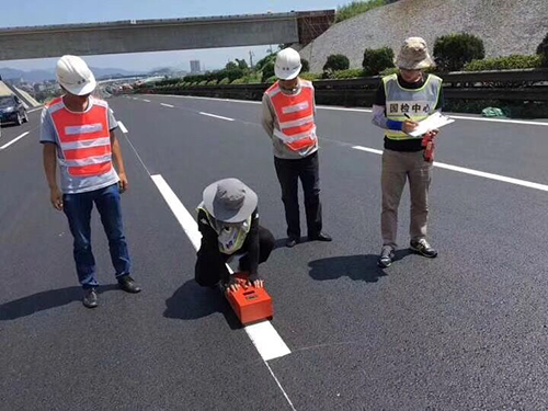 本次交工检测项目有路面的弯沉、压实度、横坡度、摩擦系数、标志、标线等,为项目最终交工验收提供依据。