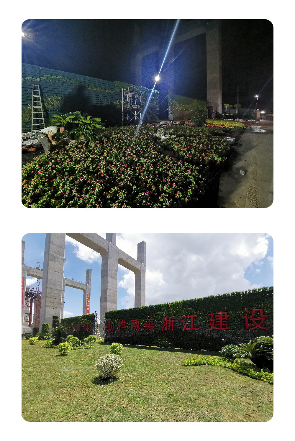 为迎接8月2日在瓯江北口大桥召开的品质工程现场会,养护中心对北口大桥三标项目部入口处进行美化提升。养护中心在接到项目任务后,开拓思路,优化方案,以克服反季节种植带来的苗木存活率低的不利影响,确保施工品质。由于时间紧任务重,全体人员加班加点,经过11天日夜奋战,于8月1日顺利完成了5000平方米绿地、300平方米立体绿化墙施工任务,为现场会增姿填彩,为助推“两美浙江”立功竞赛添砖加瓦。