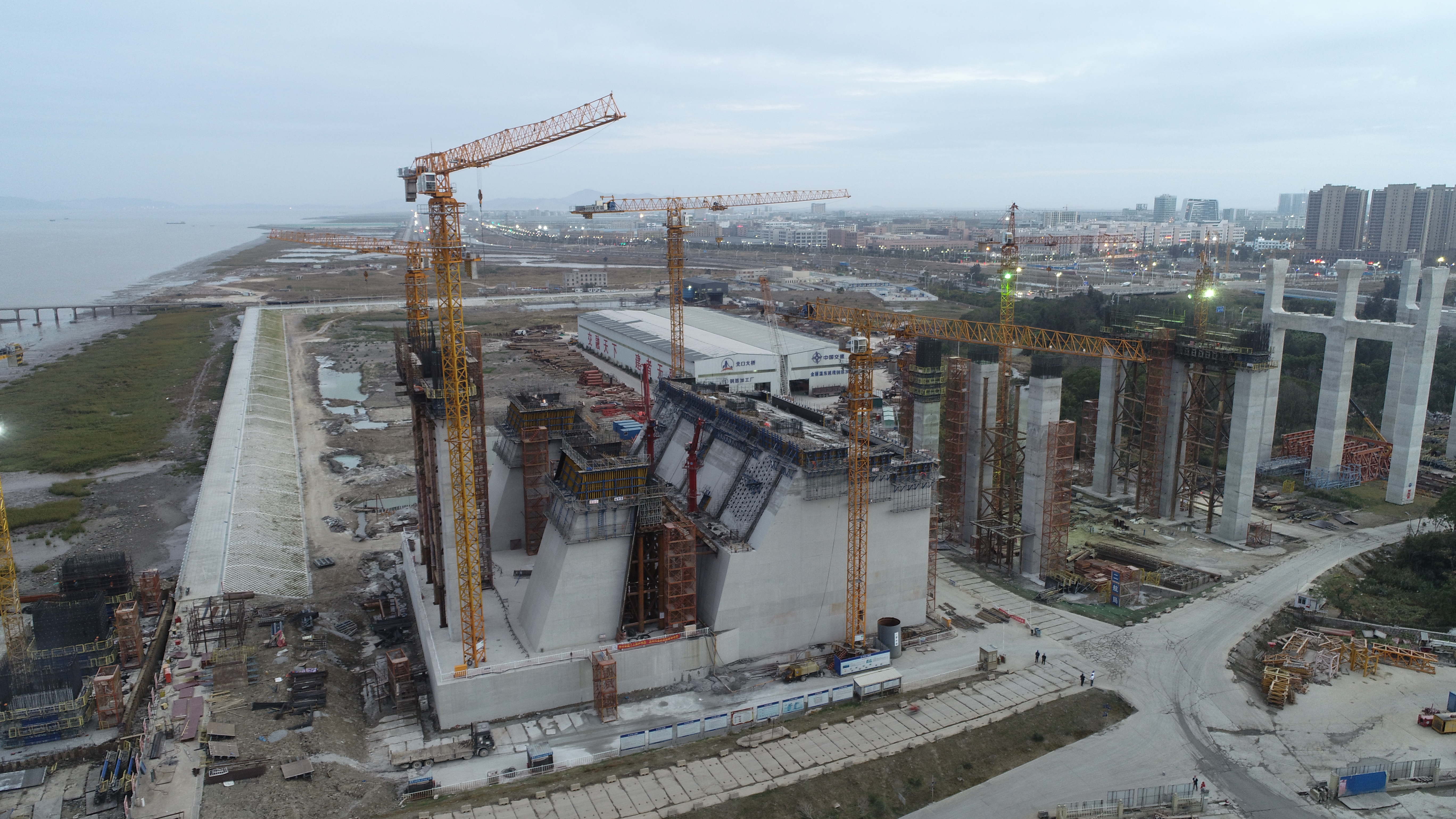 11月16日晚,伴随着混凝土泵车的轰鸣声,北口大桥南锚碇锚块施工提前完成。