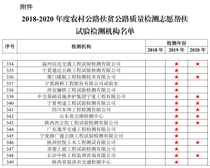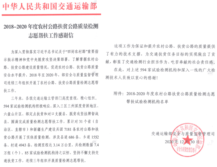 近日,国家交通运输部发出感谢信,感谢2018-2020年度594家试验检测机构积极响应习近平总书记关于“四好农村路”重要批示精神和党中央脱贫攻坚决策部署,无私奉献,辛勤工作,为交通扶贫工作提供支持和帮助,圆满完成质量检测志愿帮扶工作。