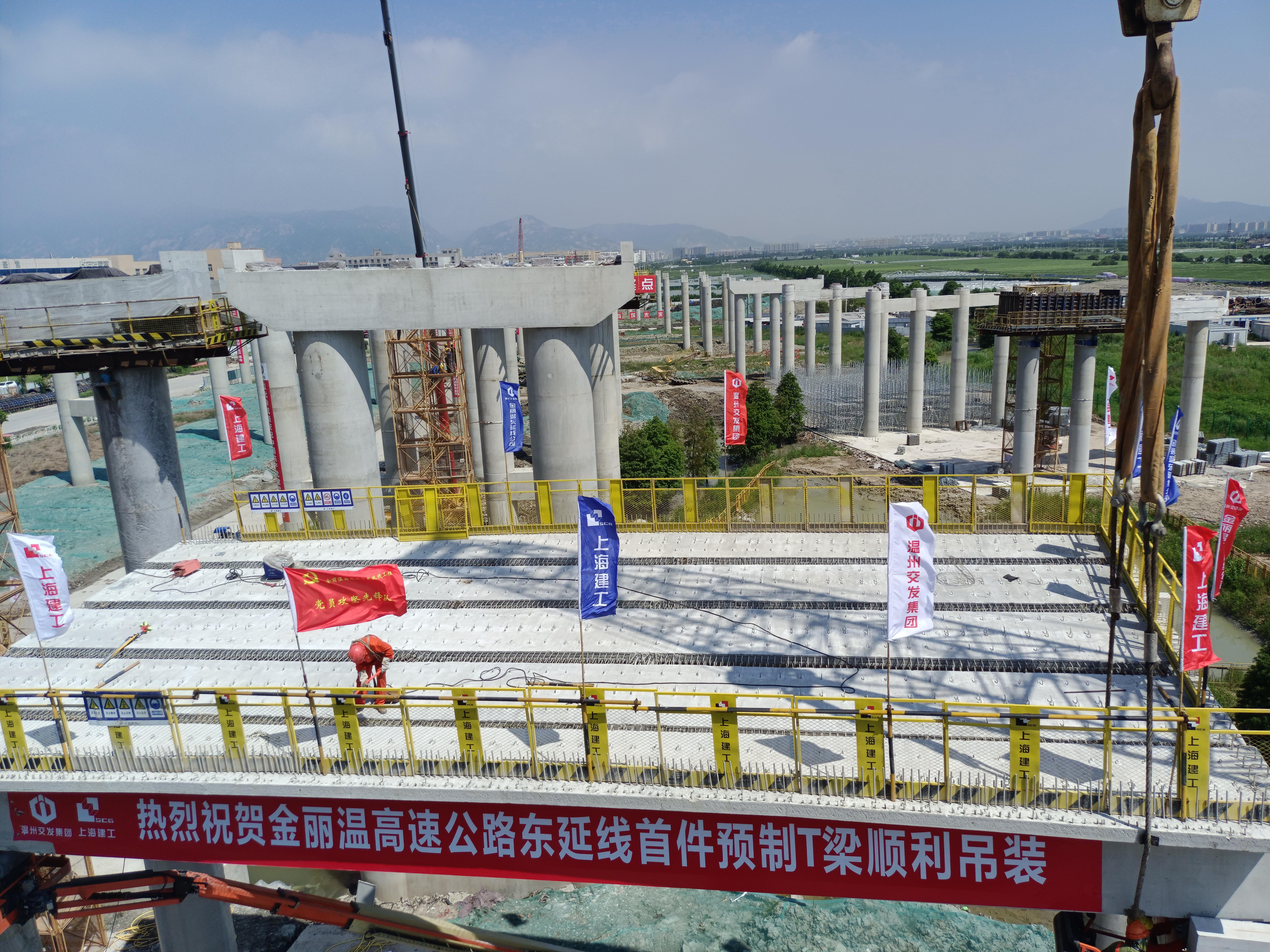 7月7日,在金丽温高速公路东延线工程的施工现场,随着一片跨径为19.3米,重达40吨的预制T梁精准对位、徐徐下降,首件预制T梁顺利吊装完成,标志着项目进一步打开桥梁上部结构施工局面,开启下半年建设“加速度”。