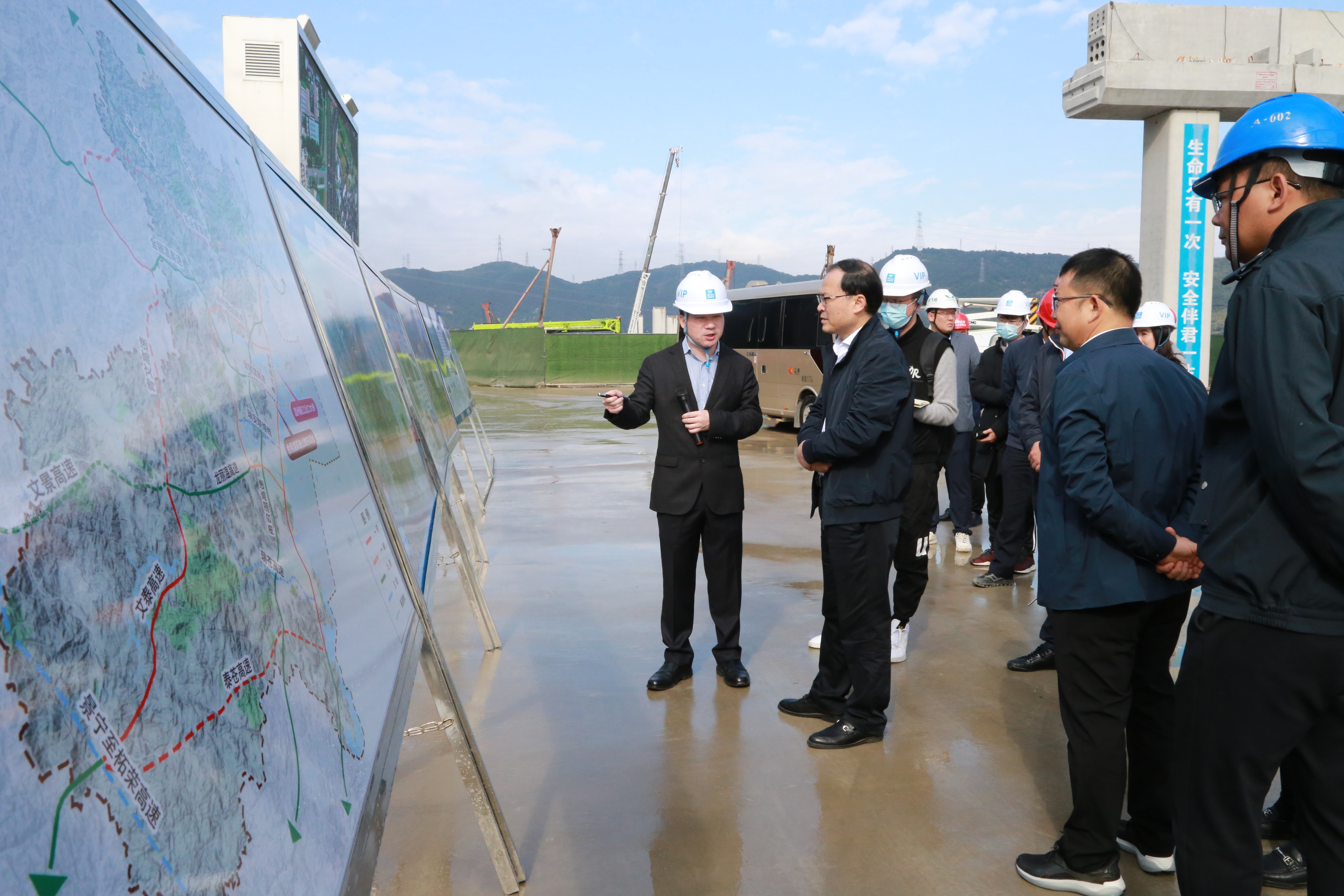 11月19日,温州市政协主席陈作荣、副主席徐有平、秘书长朱增岳等一行赴金丽温东延线工程开展重点交通工程建设视察活动,市交发集团党委书记、董事长朱三平、总经理南品仁等陪同。