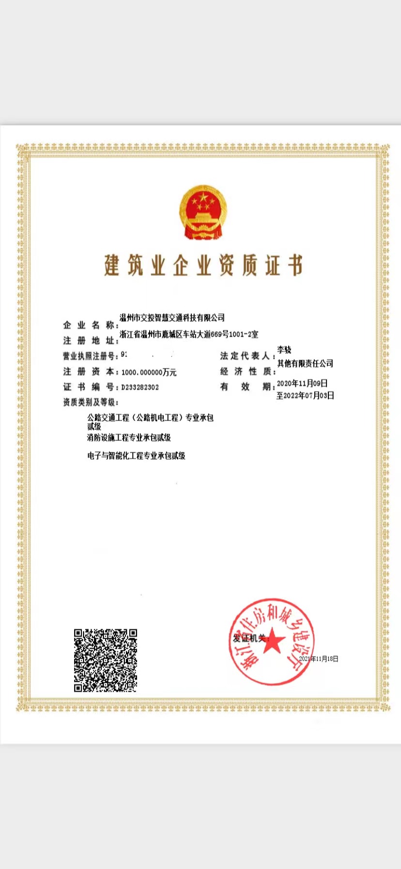 智慧交通科技公司取得消防设施工程专业承包二级和电子与智能化工程专业承包二级两项资质