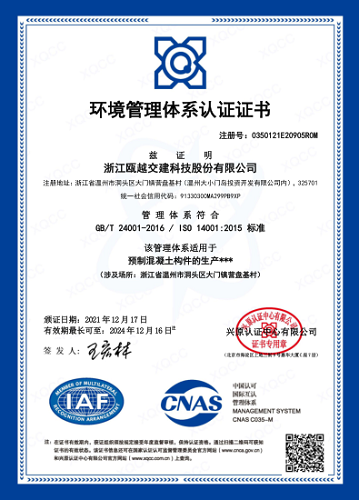 近日,市交发集团下属浙瓯交建科技公司经过兴原认证有限公司严格审核,顺利通过中国合格评定国家认可委员会(CNAS)认可,取得环境管理体系认证证书,表明公司现行环境管理体系符合ISO14001-2015标准,同时标志着公司的环境管理体系是一个规范的、科学的、健全的管理体系。至此,公司已经初步取得质量、环境、职业健康安全管理体系一体化认证。
