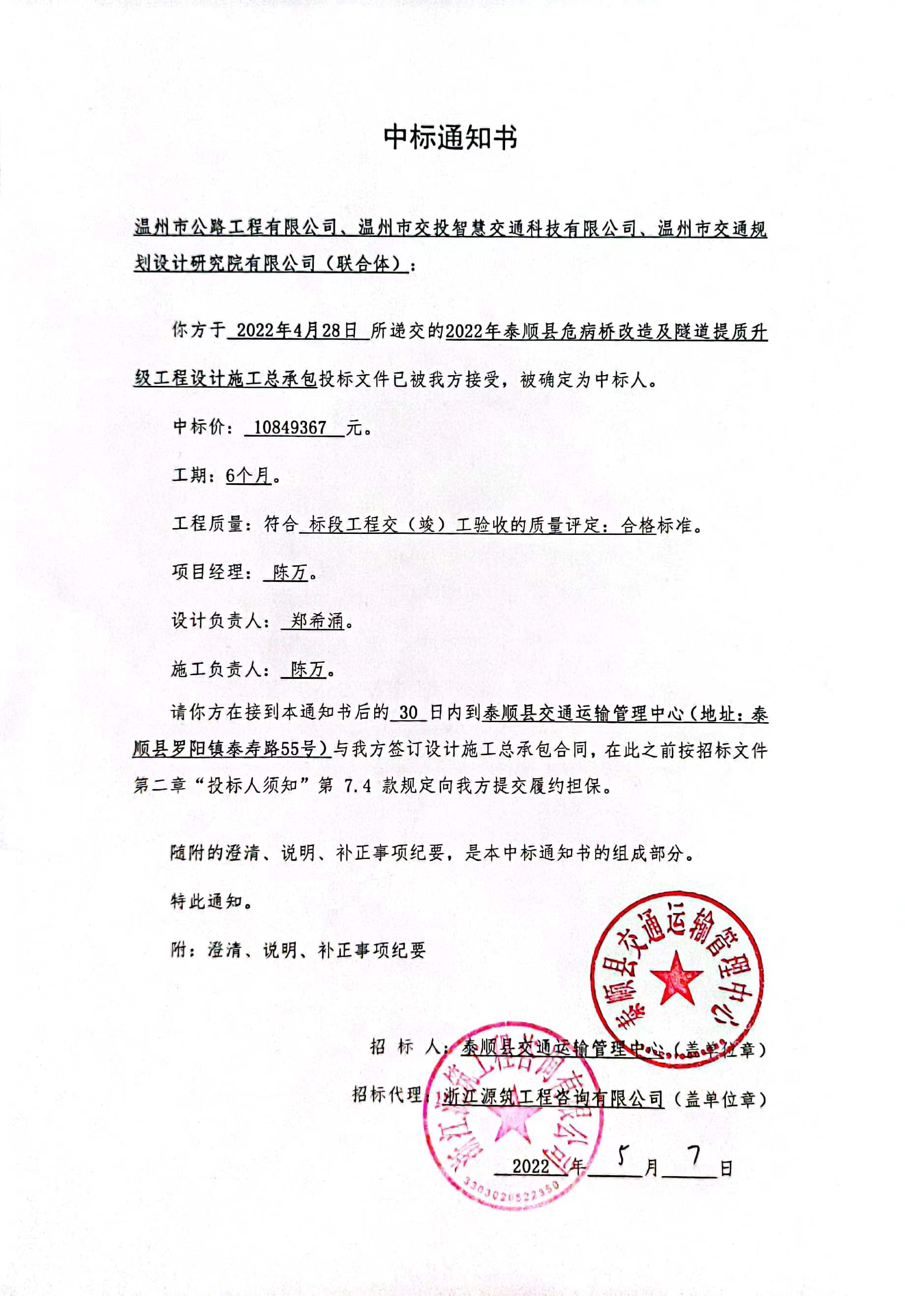 近日,温州市公路工程有限公司、温州市交投智慧交通科技有限公司与温州市交通规划设计研究院有限公司联合体中标“2022年泰顺县危病桥改造及隧道提质升级工程”设计施工总承包项目,项目总投资1085万元,总工期6个月。