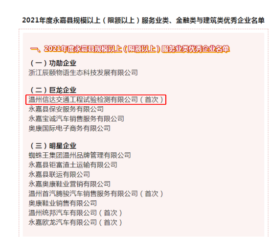 喜讯!信达检测公司首获永嘉县巨龙企业荣誉称号