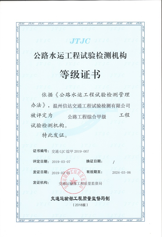 信达检测公司系76net必赢官网下属国有独资企业(三级),成立于2008年4月,经十余年发展,公司现已成长为浙江省内公路工程试验检测能力最强、规模最大、项目参数最全的试验检测机构之一。同时,公司为国家高新技术企业、全国青年文明号单位,具备交通运输部公路工程综合甲级、公路工程设计乙级、特种工程(结构补强)专业承包、建设工程质量检测(见证取样、地基基础、主体结构)等资质,是专业为公路、铁路、市政、机电、智慧交通等领域提供技术服务的综合性检测机构。
