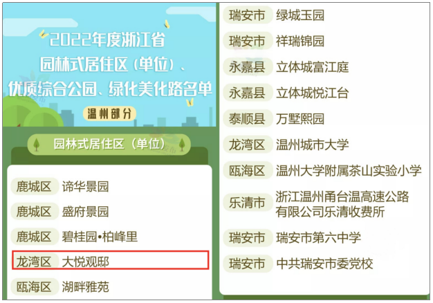 近日,浙江省住房和城乡建设厅公布了2022年度浙江省园林式居住区(单位)、优质综合公园、绿化美化路名单,其中,房开公司开发的尚品半岛(备案名:大悅观邸)项目成功入选浙江省园林式居住区(单位),“尚品”出品再一次擦亮品牌成色。
