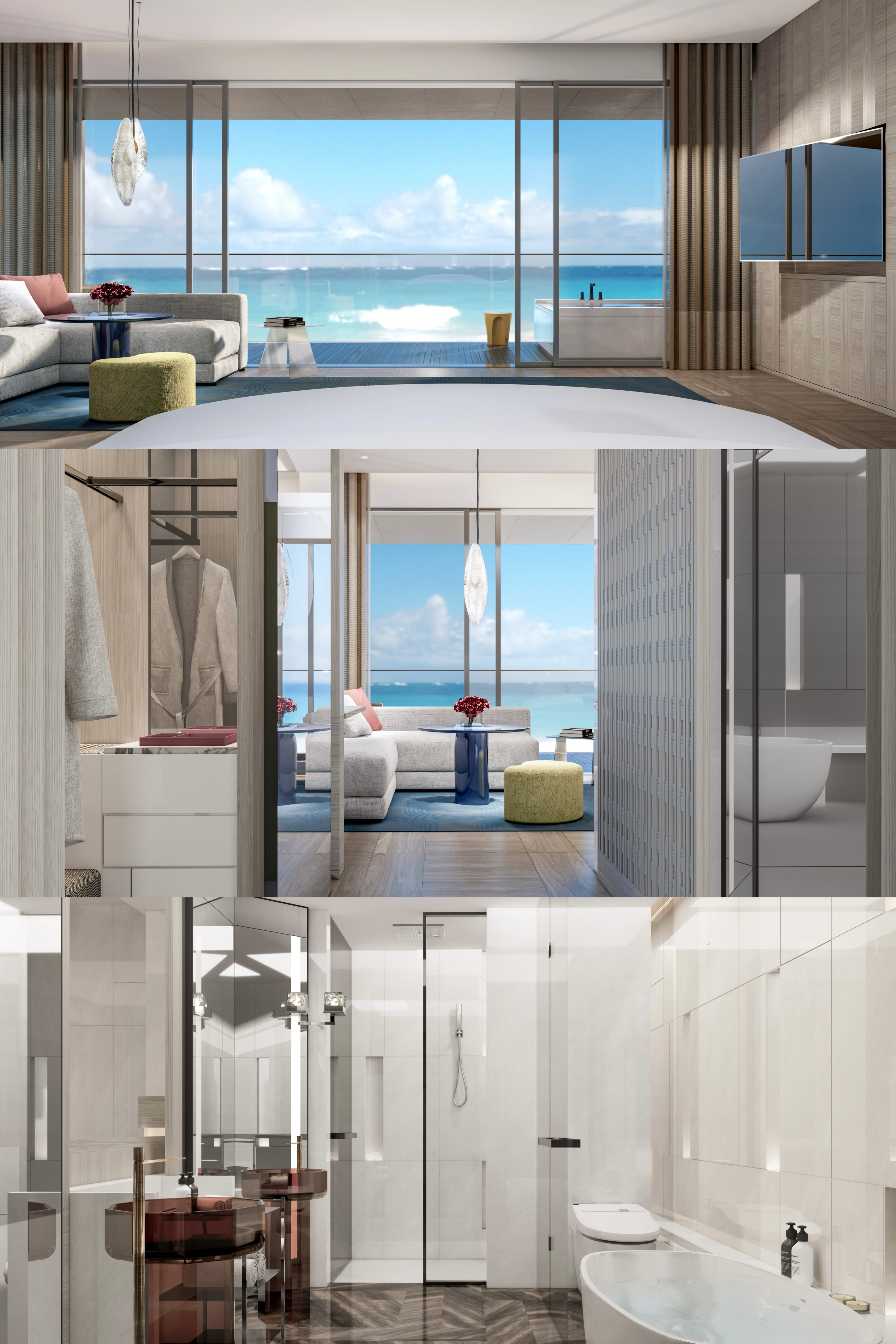 样板房施工自启动以来,先后历经总包机电改造、隐蔽施工、饰面材料上墙施工质量及工艺达标等多个关键阶段,不仅通过现场优化调整,克服了现场机电标高问题,还通过实地考察,及时沟通施工工艺工法问题,严格把控产品质量。为达到设计理想效果,项目团队认真研磨产品管理颗粒度,精心挑选天然石材,利用扫描排版技术进行错拼组合,使其完美呈现自然山石的独特肌理,并巧妙运用防旧铜金属、艺术玻璃和木材组合,表现空间的现代高级感。在色彩运用上,大胆采用玛瑙红、海洋蓝、焦石棕和贝壳银彩等鲜明色彩,既呼应自然,又年轻时尚,最终呈现出的整体现代风格效果,令人一改对传统度假酒店的刻板印象。
