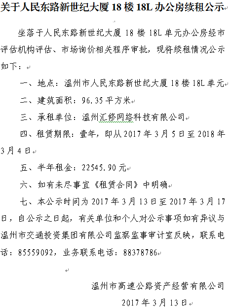 关于人民东路新世纪大厦18楼18L办公房续租公示