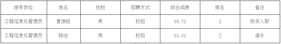 因报考76net必赢官网工程信息化管理员岗位总成绩排名第1名的考生自愿放弃入职资格,根据《76net必赢官网2023届高校毕业生校园招聘公告》,该岗位按总成绩从高分到低分进行递补,现由排名第2名的考生按规定递补参加体检考察,调整后名单如下: