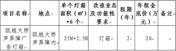根据市交投集团《关于进一步规范交投集团国有资产租赁行为的意见》(温交投【2018】188号)规定,温州市交通投资集团有限公司下属温州市高速公路资产经营有限公司就对瓯越大桥市区段声屏障广告灯箱项目经经营公司总经理办公会议研究决定,以公开招租方式进行,欢迎合格的意向承租人前来竞标。