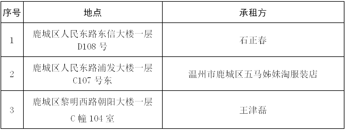 76net必赢官网下属温州房地产开发股份有限公司就所属东信大楼一层D108号、浦发大楼一层C107号东、朝阳大楼一层C幢104室资产项目于2022年7月26日发布招租公告,现将招租结果公示如下: