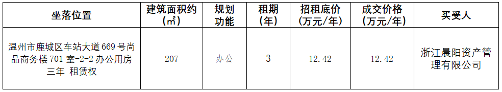 温州房地产开发股份有限公司就温州市鹿城区车站大道669号尚品商务楼701室-2-2办公用房三年租赁权于2025年9月22日至9月26日进行公开招租,经评估机构评估、委托产权交易中心竞价及公开竞价并按相关程序审批,已完成公开竞价,现将竞价结果公示如下: