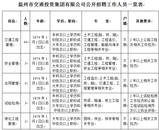 招聘岗位具体要求见《温州市交通投资集团有限公司公开招聘工作人员一览表》。