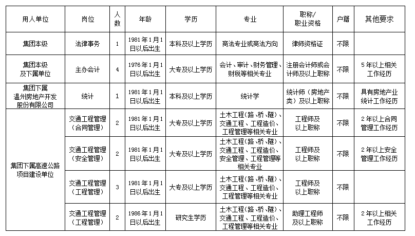 招聘岗位具体要求见《温州市交通投资集团有限公司公开招聘工作人员一览表》。