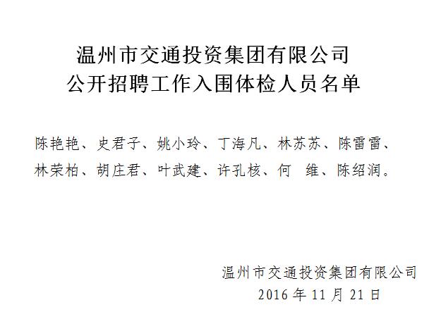 温州市交通投资集团有限公司公开招聘工作入围体检人员名单