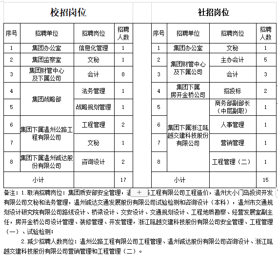一、招聘岗位及招聘人数调整。根据报名和资格审查情况,因部分岗位报名人数达不到规定比例,个别招聘岗位予以取消,另有个别岗位减少招聘人数,调整后的招聘岗位及人数如下: