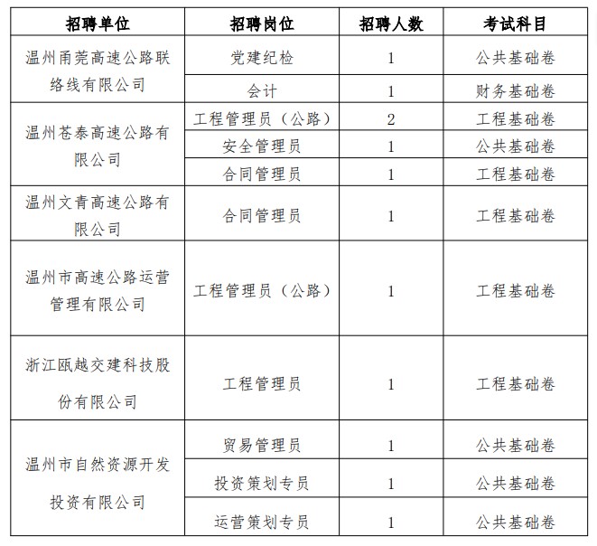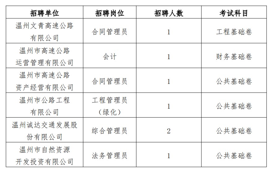 (二)社招招聘岗位中,其中温州苍泰高速公路有限公司、温州市高速公路运营管理有限公司的工程管理员(公路)岗位因报名人数未达到开考比例要求,予以核减招聘人数;温州市高速公路运营管理有限公司的征收管理部副经理岗位、浙江瓯越交建科技股份有限公司的研发管理员岗位因报名人数不足,不予开考。