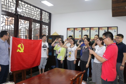 在陈列馆,面对鲜艳的党旗,支部委员王卫同志带领全体党员干部庄严宣誓,重温入党誓词,同志们一声声誓言铿锵高昂、掷地有声,再次感受作为一名党员应肩负的神圣职责和使命。在讲解员的介绍下,全体人员深入了解了党组织早期发展的艰苦历程,通过一件件珍贵的先烈遗物和一幅幅感人的画面,真实展现了革命先烈的英雄事迹,感染了现场所有人。