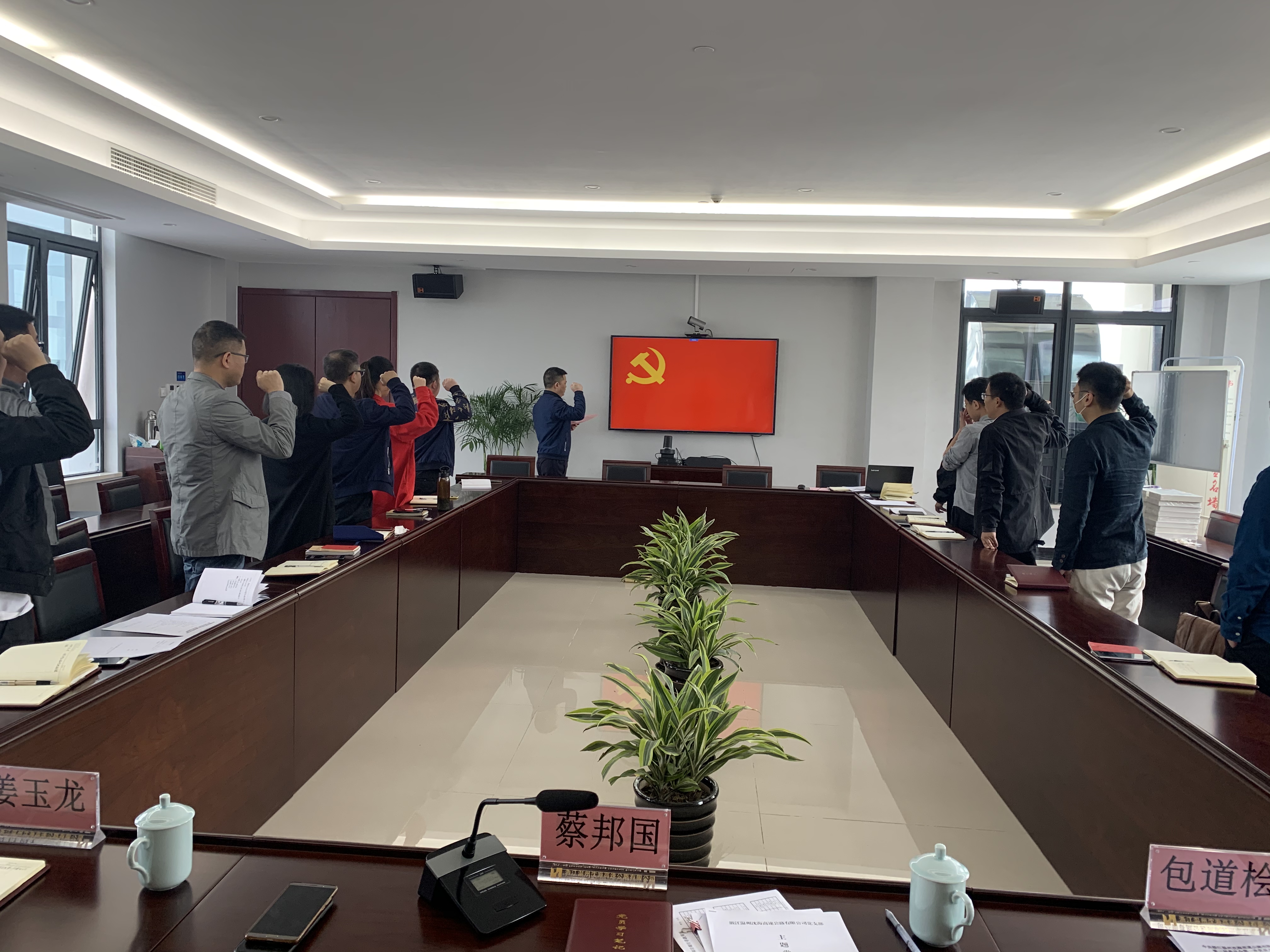 在蔡邦国的带领下,全体党员面对党旗,庄严地举起右手,大声宣读入党誓词,重温当年的决心和信念;全体党员认真学习了陈伟俊书记在全市激扬新时代温州人精神大会上的讲话精神,并对照新时代温州人精神“追求卓越、守正出新、富于创造、大气包容、美美与共、奋斗奋进”六个方面时代内涵,以“激扬精神•国企担当”为题开展大讨论。