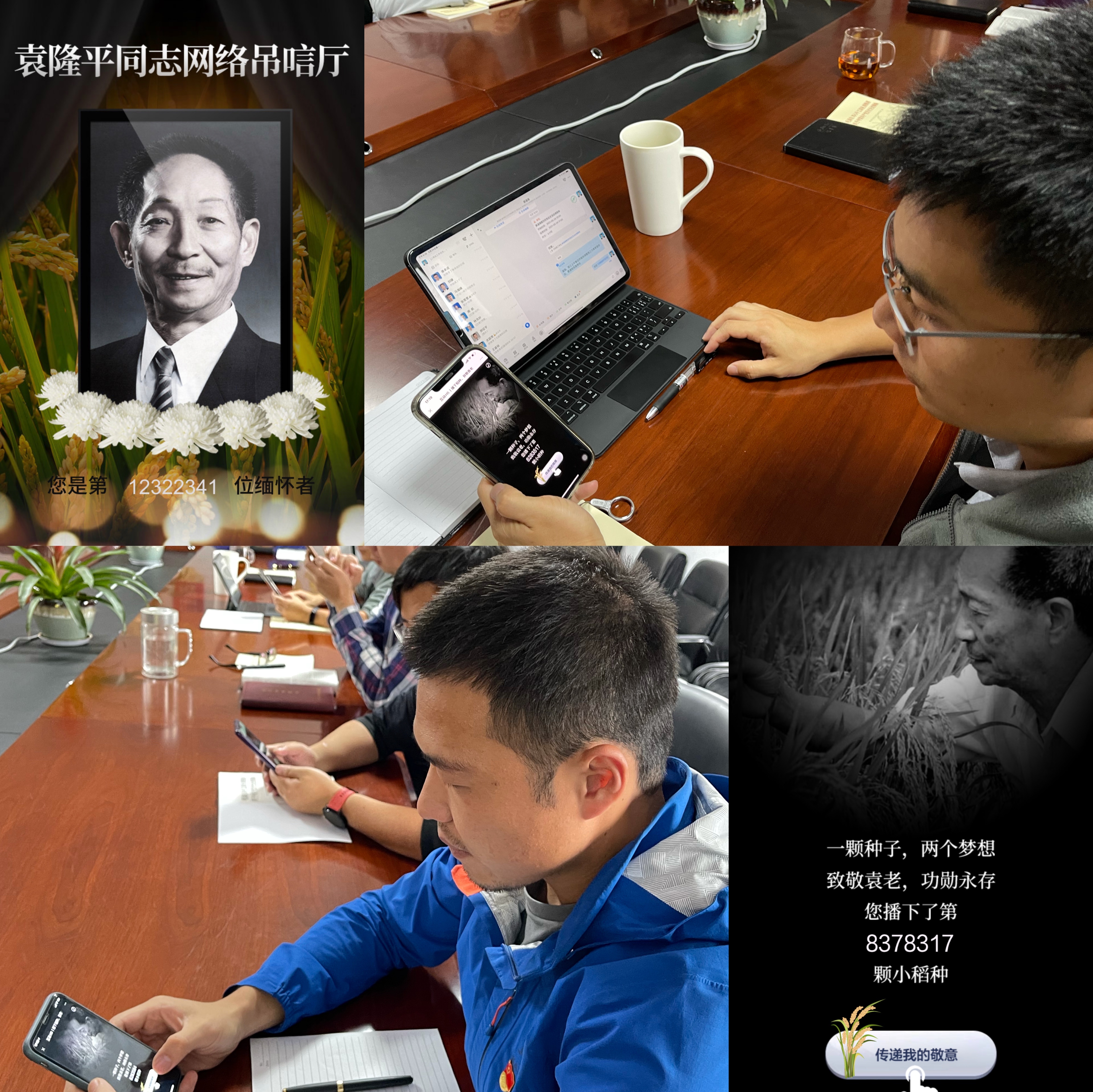 此外,全体党员还观看了袁隆平院士遗体送别仪式直播,通过“袁隆平同志网上悼念厅”献花致祭,同时在互动H5播下水稻的稻种,并集体鞠躬,默哀3分钟,致敬袁老。