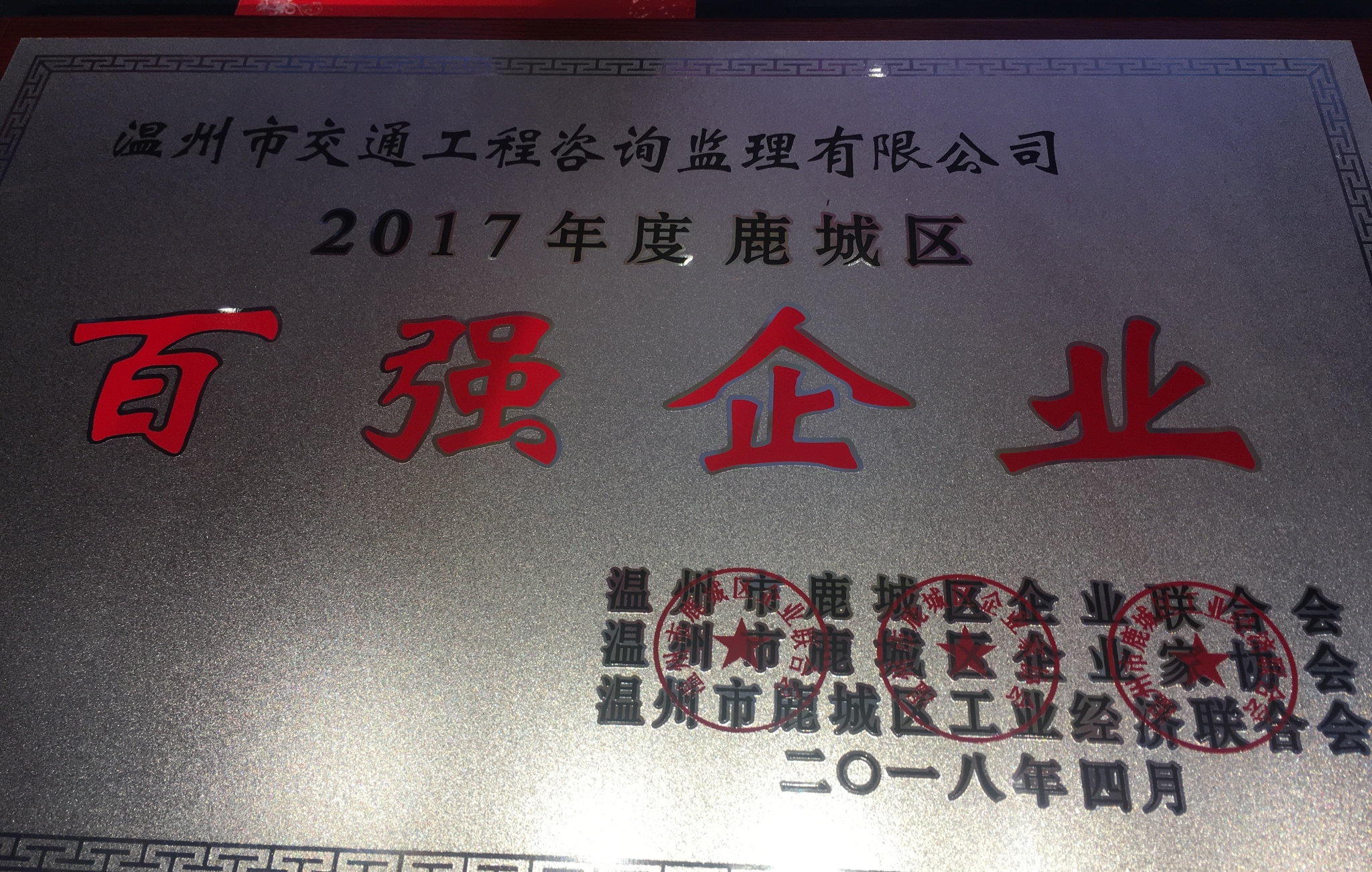 4月20日,鹿城区企业联合会、鹿城区企业家协会、鹿城区工业经济联合会共同召开第八届第二次会员大会暨2017年度鹿城区百强企业授牌仪式,会议公布了鹿城区百强企业名单,温州诚达交通发展股份有限公司被评为鹿城区百强企业,此次是公司连续4年获鹿城区百强企业称号,也是公司股改更名后首次获此殊荣。