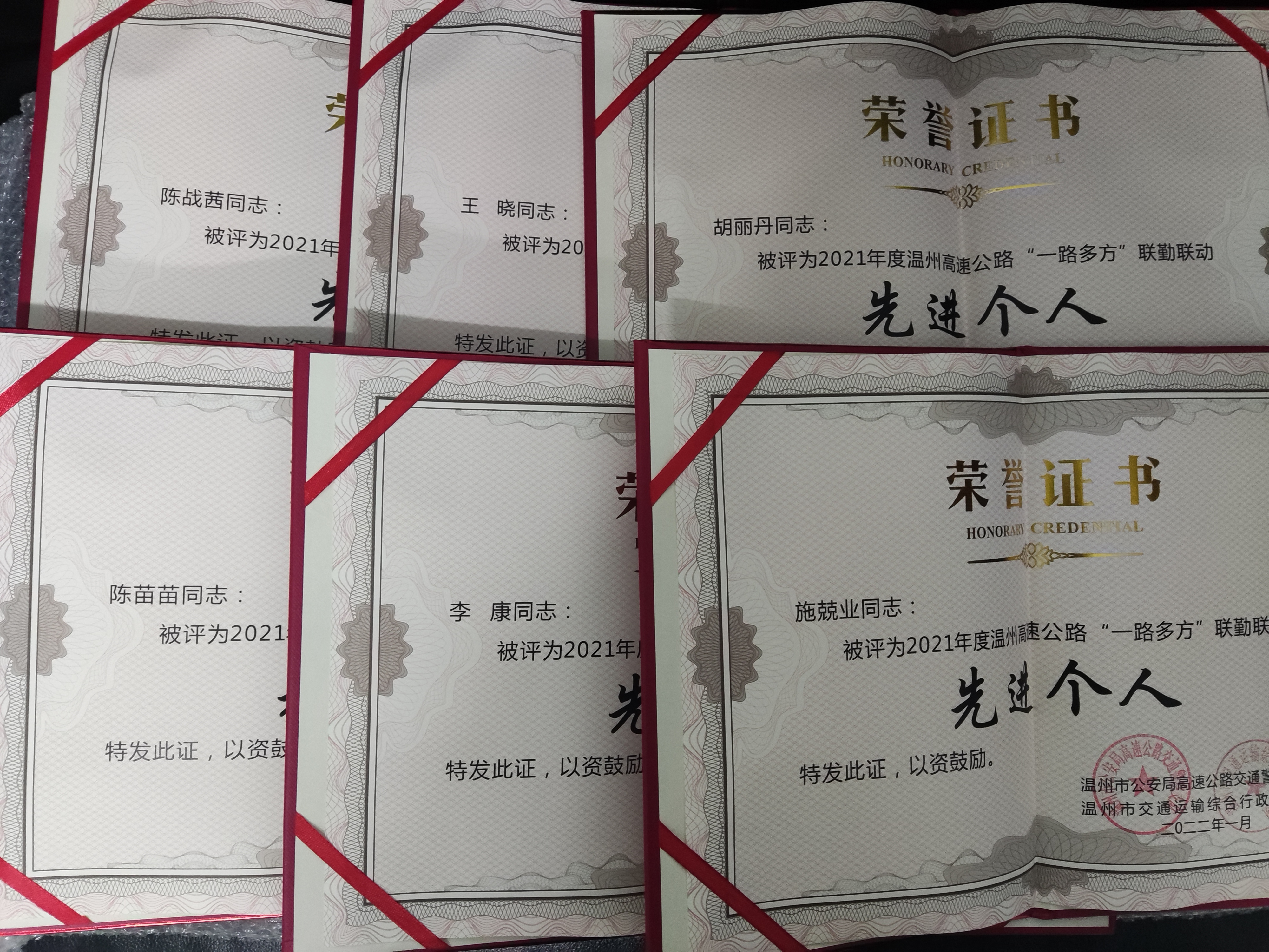 在2022年1月12日召开的温州市高速公路“一路多方”联席会议上,交发集团运营公司西片管理中心、黄田监控中心、金海湖监控中心以及陈战茜、李康、胡丽丹、王晓、陈苗苗、施兢业等6人分别荣获2021年度“一路三方”联勤联动“先进集体”“先进个人”荣誉称号。
