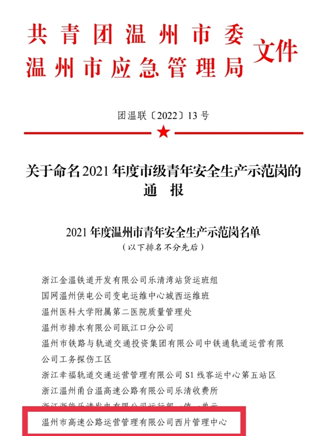 近日,温州交发集团运营公司瑞安东收费站、西片管理中心喜获2021年度“市级青年文明号”“市级青年安全生产示范岗”荣誉称号。