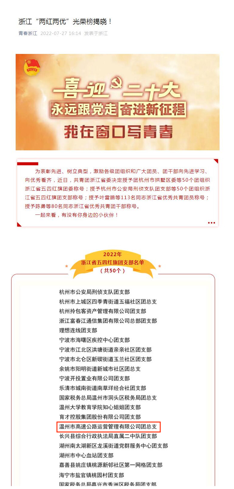 近日,浙江省“两红两优”光荣榜揭晓。温州市高速公路运营管理有限公司团总支荣获2022年度“浙江省五四红旗团总支”荣誉称号。